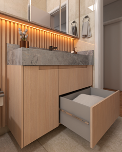 Projeto de lavabo moderno com móveis planejados que unem funcionalidade e sofisticação. A marcenaria em tom amadeirado contrasta com o tampo em pedra, enquanto o painel ripado e a iluminação embutida criam aconchego e elegância. O design privilegia linhas limpas e acabamentos refinados, resultando em um espaço sofisticado e acolhedor.